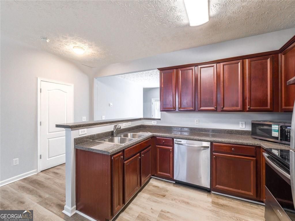 Looking for a recently updated 3-bed, 2.5-bath end-unit townhome in the desirable Thornwood Park community? This 1,404 sq ft home offers space, style, and a smart layout just minutes from major highways and Hartsfield-Jackson Airport. This bright, refreshed townhome features new LVP flooring on both the main and upper levels, plus fresh paint throughout. The spacious kitchen includes stainless steel appliances, wood cabinets, and a breakfast bar with open sightlines to the dining and living areas. Enjoy the warmth of the gas fireplace in the living room and natural light from rear-facing windows and glass patio doors. Upstairs, you'll find three generously sized bedrooms, including an oversized primary suite with tray ceiling, walk-in closet, and private bath. Two additional bedrooms and a full bath complete the upper level-ideal for families, roommates, or guests. Step outside to a private rear patio backing up to a wooded buffer with no direct rear neighbors. End-unit placement adds privacy and a side green space. Dedicated driveway parking in front, no rental restrictions, and a 3-year-old HVAC system add convenience and value. Whether you're buying your first home or adding to your investment portfolio, this Atlanta townhome offers a strong opportunity in a fast-growing area. Schedule your showing today!